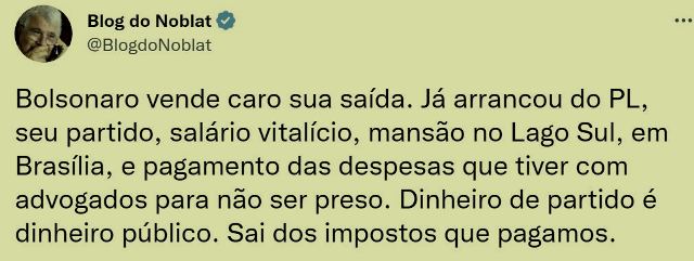 – E, fora da Presidência, vai continuar sendo bancado pelo meu, pelo seu, pelo nosso… já que salários e mordomias (advogados inclusos) serão pagos com fundos partidários do PL, cuja fonte também é o Tesouro.