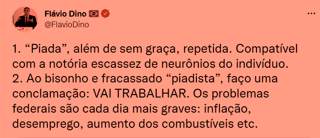 – Como tal, quem deveria ocupar mais espaço no governo eleito é esta Frente Ampla, mas quem está fazendo isto é o PT, que quer mandar em tudo. Na visão da elite, a incompetência e o autoritarismo bolsonários nunca foram problemas. – – Problemas são as políticas sociais do Lula e do PT, que limitam seus lucros, obrigando-os a trabalhar e impeindo-os de coçar o saco em Miami e alhures.