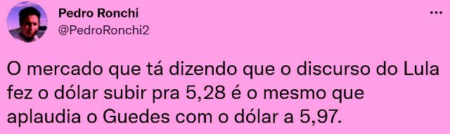 – É assim que o mercado sobe ou desce, de modo que quem tem dinheirão sempre ganha. E, pra justificar isto, há as causas (ou desculpas): o Lula não falou em controle fiscal, o Lula não anunciou o ministro, o FED americano vai subir os juros, Putin ameaça guerra nuclear…