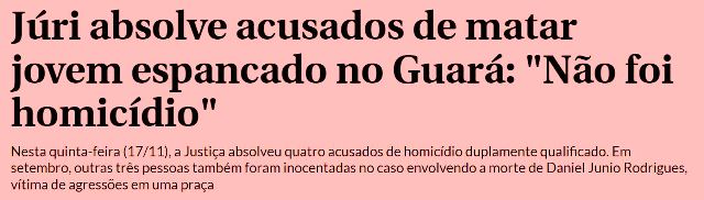 – O jovem foi cercado, começou a correr, tropeçou, caiu e bateu a cabeça no chão, morrendo. O júri decidiu que não houve homicídio, vez que o culpado pela morte foi o chão, que é inimputável. Todos foram soltos. Cuidado pra não encontrá-los pelo Guará…