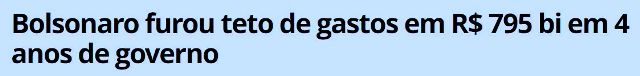 1 – A notícia foi dada pela BBC, a partir de levantamento do economista Bráulio Borges,da FGV: durante os 04 anos bolsonários, os gastos do seu governo acima do teto somaram R$ 794,9 bilhões. Alguém se lembra de ver o mercado nervoso então? Ou a imprensa?