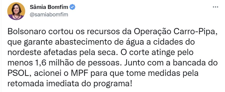 3 – Durante a campanha eleitoral, o MitÔ tentou convencer os nordestinos que a transposição do São Francisco era obra dele. Não conseguiu. Debaixo da cama no Alvorada, perpetrou a vingança: cortou os recursos da Operação Carro Pipa.