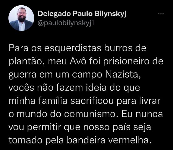 1 – Há mais um patriota na minha rede. Detesta o comunismo porque o avô foi prisioneiro de guerra nazista, o que é meio confuso, né? Por causa do avô, ele é anti nazista ou anti comunista? Fora isto, o padrão fascista é o mesmo…