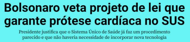 3 – Antes de sair de baixo da cama e voar pros Estados Unidos, o MitÔ deu um sinal de sua imbrochabilidade e demonstrou toda sua autoridade presidencial: vetou prótese cardíaca no SUS. A justificativa é a duplicidade de objetivos, vez que o SUS já tem procedimento parecido.