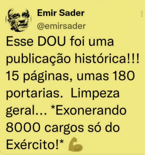 – A resposta está no Diário Oficial: todos foram exonerados com uma canetada só! E os acampamentos de patriotas não ficaram mais cheios… Ao contrário, muitas mulheres se mandaram pra casa pra consolar os maridos , que perderam suas boquinhas extras, também pagas por nós.