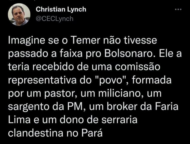 – No Brasil, antes da loucura virar guerra, há acordões por cima, quando as lideranças combinam o butim pra cada lado, se satisfazendo por algum tempo. De qualquer modo, quem mais sofre é o povo, que não participa do jogo. Nestes 04 anos, mudou-se este normal.