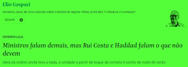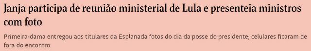 5 – Não sei se é viés machisra ou editorial. É mau jornalismo, com certeza! O fato é que a Folha noticia a lembrança que Janja deu a todos os ministros na 1ª reunião convocada por Lula, uma foto dos 37 sendo empossados. E tasca na manchete que Janja “participou” da reunião.