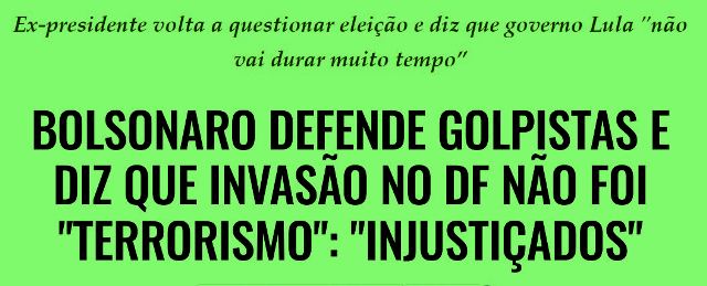 7 – No Brasil, desfilando com o “protetor” escolhido pelo marido, Michelle desfila pelo Congresso e anuncia: “Olhem eu aqui!” Em Orlando, mudando de mansão, o ex-mitô torna-se palestrante e dá declarações golpistas como sempre. Acho que não volta mais à Pátria.