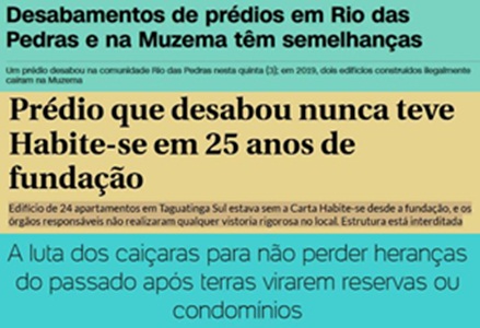 1 – No Rio, prédios mal construídos pela milícia ruíram matando gente. Em outras cidades, prédios sem habite-se são construídos e financiamentos habitacionais são concedidos pelos bancos. Em cidades serranas e à beira-mar, condomínios de luxo expulsam os caiçaras pra áreas de risco.