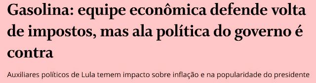 – Daí porque ela, a grande imprensa, já começou a criar picuinhas entre a nova equipe econômica e Lula. Sem sutilezas. Depois dos juros, a briga, agora, é a desoneração da gasolina: se Lula adiar a medida, desmoraliza Haddad e sua equipe. Quem sabe Haddad se demite?
