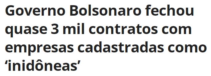 – Como eles acham que a imprensa é esquerdista, não adianta mostrar fatos divulgados por ela. Mas, eu tento: a Transparência Brasil indicou que o governo do ex-mitô assinou 2.912 contratos com 168 fornecedores inscritos no Cadastro de Empresas Inidôneas e Suspensas (Ceis).