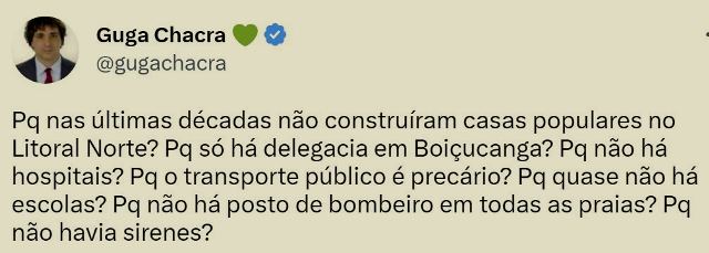 – Eu refresco a memória e comparo: passeava de jet ski nos mares de Santa Catarina. E Lula, agora nos temporais no litoral de São Paulo? Exatamente lá, junto com 11 ministros…