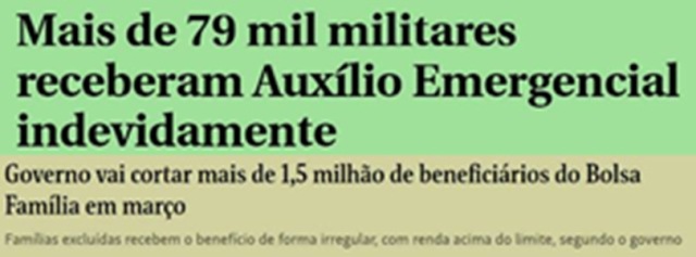 3 – Governo anuncia que mais de 1,5 milhão de beneficiários do Auxílio Brasil vão ser cortados em março, pois não têm e não tinham direito de receber o benefício. E o que eles receberam indevidamente, vai ser devolvido? A propósito, uma dúvida dos tempos da covid: