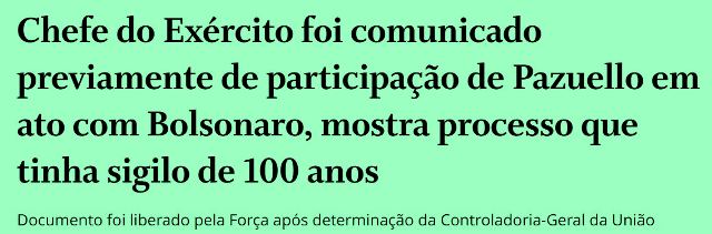 5 – Mais uma promessa de campanha cumprida: sigilo centenário do processo contra o general Pazuello por participar de comício político foi aberto pelo ministério da Defesa. E mostra claramente que o comandante do Exército desrespeitou o Regimento militar.