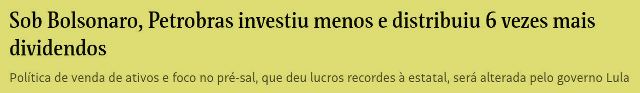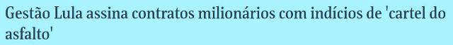 5 – O texto dos repórteres é claro e objetivo: “O governo Luiz Inácio Lula da Silva (PT) assinou contratos de cerca de R$ 650 milhões herdados de Jair Bolsonaro (PL) que levam para a atual gestão uma série de empreiteiras e condutas suspeitas de prática de cartel em obras de pavimentação.”