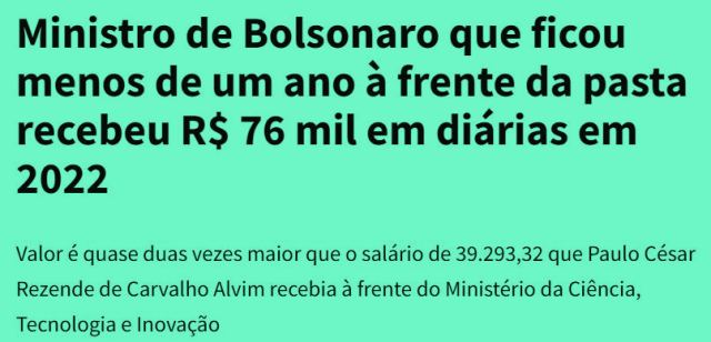 5 – É impressionante como não escapa um! A cada tapete que se levanta, lá está um ministro do ex-mitô envolvido em algum golpe contra os cofres públicos. O mais recente foi o substituto do astronauta na Ciência e Tecnologia, que foi ministro por apenas 10 meses.