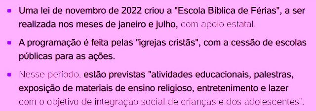 – Mas ninguém se preocupa com outro tipo de organização que, sem armas mas com leis aprovadas nas Assembleias, ocupam o Estado sorrateira e indevidamente: além de lutar por total isenção de impostos, os evangélicos já se acham no direito de ocuparem escolas públicas.