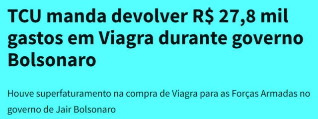 1 – Em tempos bolsonários, foi um escândalo que virou piada, mais uma que levou desmoralização às Forças Armadas: a milionária compra de Viagra. Investigado o assunto, o TCU descobriu que houve mutreta na compra feita por um hospital da Marinha…