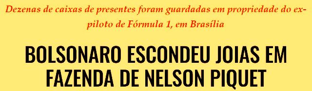 7 – O que me espanta não é o ex-mitô continuar bancando o homem do povo com seu reloginho e sua caneta BIC, enquanto, ao que tudo indica, esconde joias, diamantes, Rolex e canetas folheadas a ouro na fazenda do vizinho e irmão camarada Nelson Piquet.