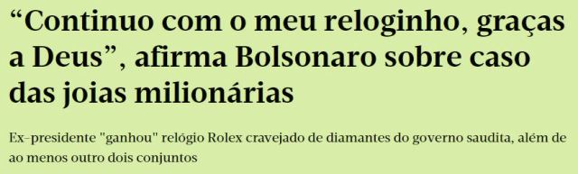 3 – O senador e ex-chefe da Casa Civil do ex-mitô sobre o 3° pacote de joias embolsado pelo seu ex-chefe: “Bolsonaro não tem cara de ladrão, não tem atitude de ladrão….” Faltou completar que Bolsonaro é branco de olhos azuis e que é um homem rico… de imóveis!