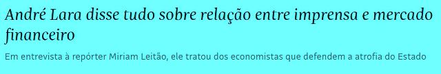 3 – De André Lara Rezende, um dos pais do Plano Real: “Essa [é a] visão dominante entre os economistas do mercado financeiro. Quem aparece na grande mídia são 99% os economistas que trabalham no mercado financeiro. Eles falam consigo mesmo.”