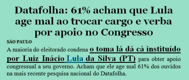 9 – A Folha continua dando manchetes negativas pra Lula, a partir das pesquisas do Datafolha. Esta é sobre o toma lá dá cá tradicional da política brasileira. E, pra reforçar a oposição, ainda diz que tal política foi instituída pelo Lula.