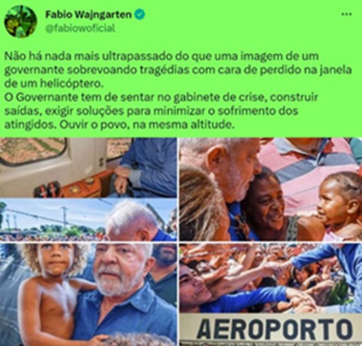 – Ele se baseia na atitude do seu chefe, que foi passear de jet ski no mar de Santa Catarina enquanto temporais e enchentes destruíam e matavam na Bahia e em Minas.