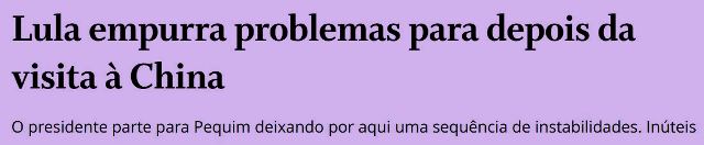 – Mas, eles precisam criticar Lula, senão os patrões próximos e distantes os demitem. A coluna do Sardenberg n’O Globo é explícita: Lula empurra os problemas e o Mercado fica nervoso. Daqui uma semana, outra coluna dirá que o Mercado ficou nervoso porque Lula voltou da China…