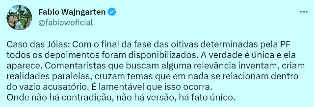 7 – Entendeam o que o Wajngarten disse? As joias não existem, gente… Os 03 pacotes são uma invenção de comentaristas que vivem numa realidade paralela. O ex-mitô não pediu nem recebeu… Seu chefe muito amado, é absolutamente inocente de qualquer coisa.