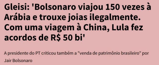 – Gleisi tem que brigar mais alto: com a elite financeira, empresarial e multinacional. Ela tem que continuar batendo nos juros, no Mercado, no capital especulativo, nos políticos serviçais da elite… O ex-mitô ainda está vivo exatamente porque o PT o mantém no palco.
