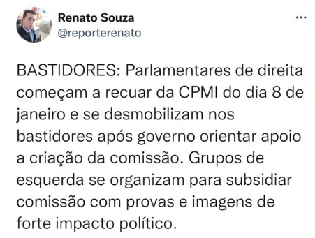 9 – Desde o início eu estava estranhando as posturas de oposição e governo em relação à instalação da CPI do golpismo fascista. Oposição querendo investigar seus apoiadores e governo não querendo dar palco para um golpe em que está mais que provada a culpa do bolsonarismo?