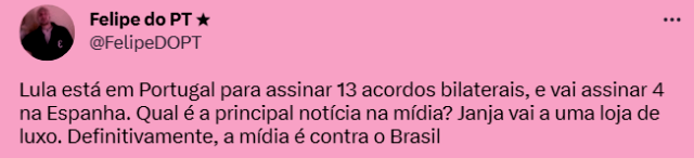 3 – Na visão um tanto míope da Mídia, isto é imparcialidade! Michelle foi a Orlando combinar uma versão sobre as jóias das Arábias com o marido e foi flagrada fazendo compras numa loja de luxo. Era importante também flagrar Janja numa loja de luxo em Lisboa.