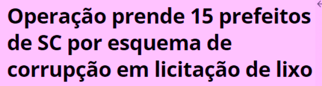 7 – Tinha que ser em Santa Catarina, o Estado mais bolsonarista do país! Até agora, 15 prefeitos (e vices e secretários) já foram presos numa operação policial (Mensageiro) que investiga esquema de corrupção em licitações de lixo. Até agora!
