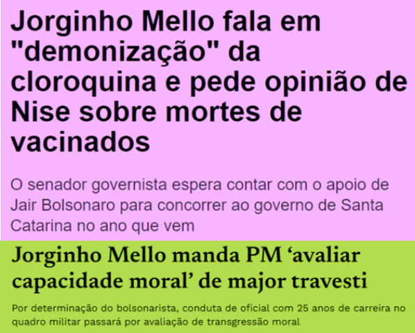 3 – Jorginho Mello, governador de Santa Catarina, mandou a PM “avaliar a capacidade moral e profissional” de uma oficial trans com 25 anos de serviço na PM. Quando senador na CPI da covid, que matou 700 mil brasileiros, ele defendeu o uso da cloroquina,…