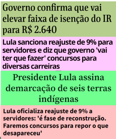 1 – O governo Lula está completando 04 meses. Ao contrário dos 04 anos anteriores, as medidas que beneficiam o povo, objetivo de um governo democrático (do povo e pro povo), estão sendo tomadas rapidamente: novo salário mínimo em maio, aumento da isenção de IR…