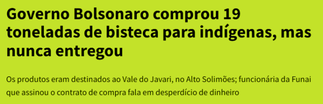 3 – Nosso Parlamento é uma gracinha, como dizia Hebe. O Estadão passou 01 mês fuçando 5,5 mil compras de alimentos pros indígenas feitas pela FUNAI bolsonarista, metade sem licitação, e constatou que 12 toneladas de bisteca congelada nunca foram entregues.