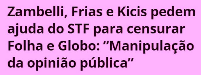 – Mudaram de opinião. 19 deputados do PL pediram ao Xandão oficialmente que proíba a Folha e o Grupo Globo de noticiar informações sobre o PL das Fake News. Próximo passo do grupo: censurar a imprensa e exigir que o noticiário só possa ser feito via fake news.