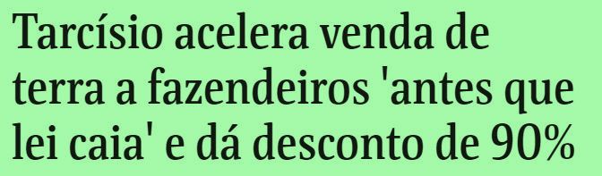 5 – Eu sei que é comum na política brasileira, e só sinto que a população seja tolerante com este tipo de política. O governador de São Paulo está vendendo terras do Estado (que não são dele, claro, que nem é paulista) para os ruralistas, seus eleitores, com desconto de 90%.