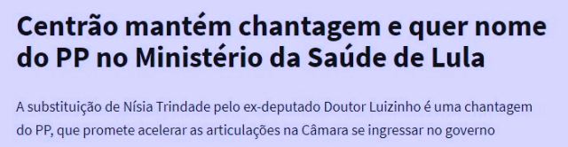 3 – Estou avisando! Se o Centrão continuar pressionando o Lula pra botar um dos seus no Ministério da Saúde, eu não votarei em nenhum candidato deles nas próximas eleições. Eu não voto no PP pra que seus eleitos se preocupem com a saúde dos brasileiros…