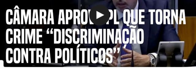 9 – A Câmara aprovou um PL da lavra do ex-todo poderoso Eduardo Cunha, que “criminaliza” discriminação contra os parlamentares e seus familiares, como se discriminalizar qualquer cidadão já não fosse proibido pela Constituição. Mas, eles precisam se sentir como uma casta…