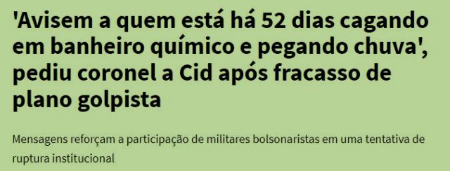 9 – Analistas e comentaristas da grande imprensa estão chocados com a estupidez dos articuladores do golpe, a partir das mensagens do celular do tenente coronel Mauro Cid. A imbecilidade é grotesca e é espantoso que um “brilhante” oficial do Exército faça parte deste jogo.