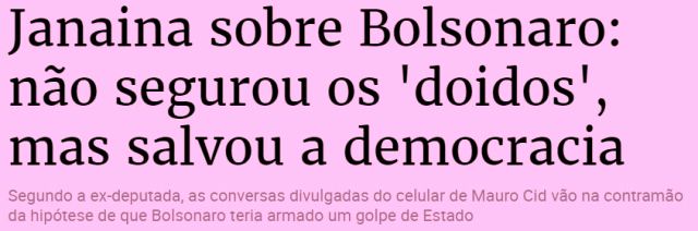 3 – Janaína Paschoal é uma gênia incompreendida. Conseguiu perceber que o ex-mitô falou contra as urnas, contra o sistema eleitoral, contra o TSE, colocou seu ajudante de ordens como coringa na preparação do golpe só pra não dar o golpe e, com isso, salvar a democracia…