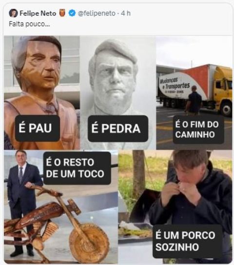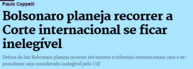 5 – É óbvio que a defesa do ex-mitô vai fazer tudo pra mantê-lo em evidência, sempre no papel de coitadinho perseguido pelos comunistas do PT. O gado precisa ser alimentado até as eleições de 2024 pelo menos. Como disse Waldemar da Costa Neto, a inegibilidade…