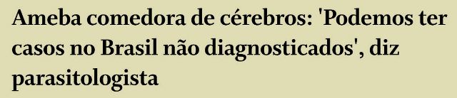 9 – Parasitologista brasileira, especialista em Naegleria fowleri, a ameba comedora de cérebros, não anda lendo o noticiário do país. Se o fizesse, não diria que “podemos ter casos (da ameba) no Brasil”. Elas se lambuzam de cérebros brasileiros há 04 anos e meio!