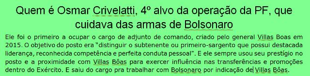 – Até agora, protegido pelo pai, o menino se recusou a fazer uma delação premiada. Agora, vai pegar muito mal pro Exército se o general resolver fazer uma tal delação pra salvar o filho. A sinuca de bico está armada! Te cuida, Bolsonaro!