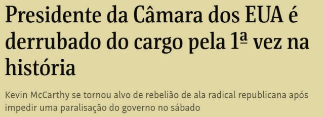 3 – A imprensa familiar não deu qualquer destaque a um fato histórico na maior democracia do mundo e nem os deputados se manifestaram a respeito: o presidente da Câmara dos Estados Unidos foi destituído do cargo pelos próprios deputados, inclusive…