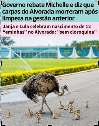 9 – A reconstrução do país jogado no lixo por 06 anos, é um caminho lento e cheio de obstáculos. Assim, não é nada não é nada, mas o nascimento de 12 emas no Alvorada é mais um passo nesta direção. O casal anterior de inquilinos do Palácio não gostava de gente nem de animais…