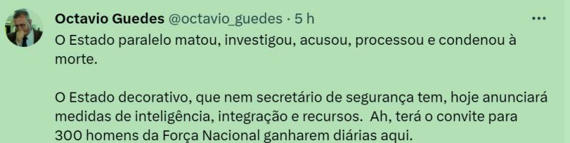 – E tudo a partir de uma vídeo-conferência entre os chefões das milícias feita dentro de Bangu 3. E, pra arrematar, avisaram os policiais incomodados onde estavam os corpos dos assassinos… Mas o Rio de Janeiro continua lindo!