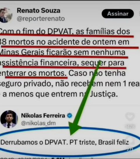 7 – Os bolsonaristas, como Nikolas Ferreira e Sargento Fahur, foram às redes para comemorar a queda da cobrança do DPVAT. Não imaginavam a reação do povão, que tem consciência que este imposto existia pra beneficiá-lo. Mais dia, menos dia vão ter que compensar isto.