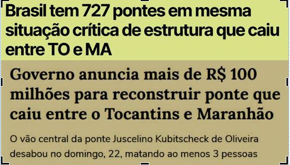 3 – Há tempos, o DNIT vinha sendo alertado pro estado precário da ponte JK, única ligação entre Tocantins e o Pará. Mas as verbas eram curtas e havia situações aparentemente piores em outras rodovias. E ela desabou, causando mortes e despejo de ácido sulfúrico no rio.
